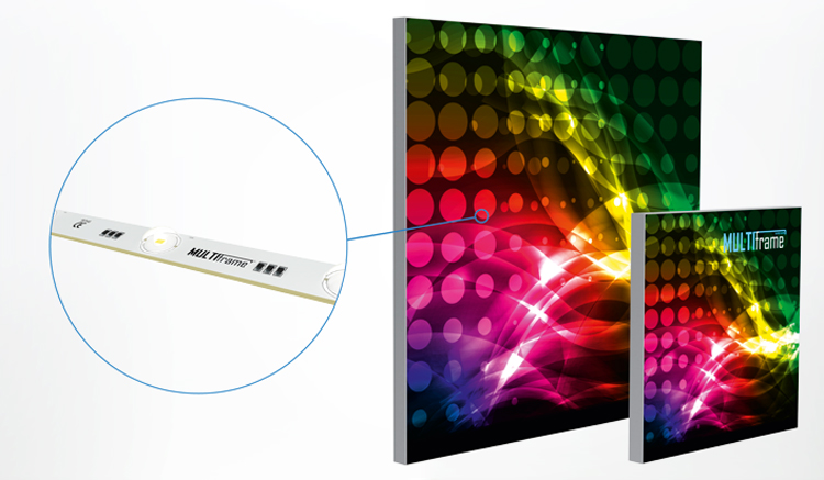 Der MULTIframe SUPER SLIM von PAGEfactory in Kaufbeuren, Kempten, Marktoberdorf, Füssen und Mindelheim ist ein vollflächig hinterleuchteter LED Rahmen mit einer Bautiefe von nur 35 mm. Das einseitig verwendbare Aluminiumrahmenprofil ist superflach und eignet sich hervorragend für Wandmontagen. Durch die spezielle Linsenform der LED Module kann man trotz der schmalen Bautiefe keinerlei Lichtpunktbildung auf der Stoffoberfläche entdecken – das Motiv wird einheitlich und schattenfrei dargestellt. Die Stoffgrafiken werden mit Gummilippen versehen. Dies ermöglicht einen einfachen und raschen Grafikwechsel. Nicht nur die Leuchtkraft von ca. 7000 lm, sondern auch die homogene Ausleuchtung, machen den MULTIframe SUPER SLIM zu einem Leuchtrahmen, der alle ähnlichen Produkte in den Schatten stellt. Alle Systemteile sind auch als Einzelteile erhältlich.